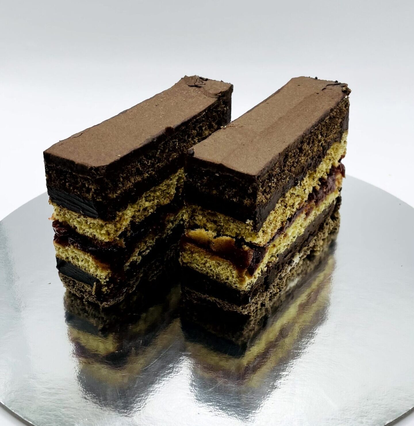 Kakaós és világos tésztalapok zselés meggytöltelékkel és csokoládékrémmel töltve